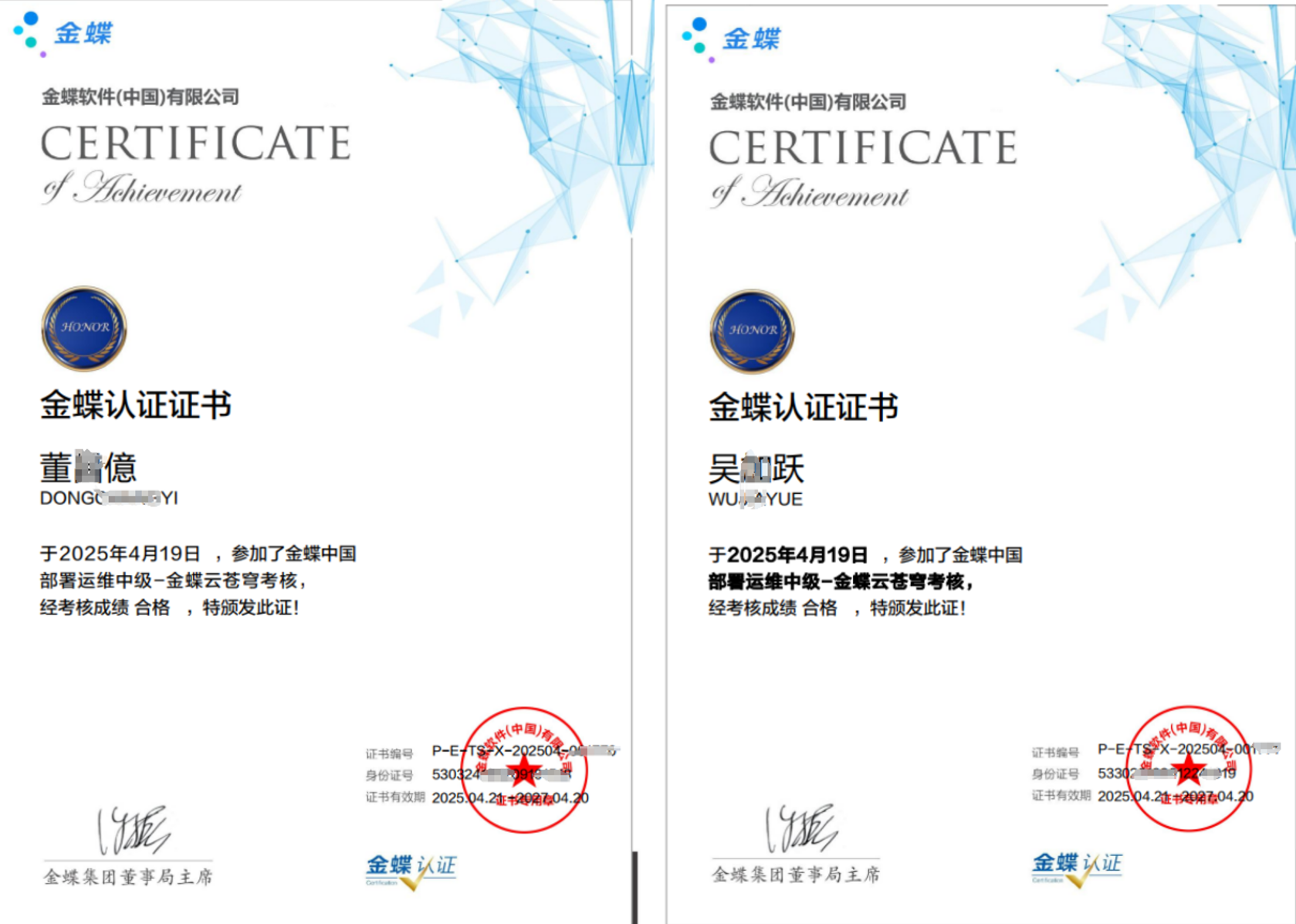 同时,公司技术团队核心成员董昌億、吴加跃成功通过金蝶云·苍穹部署运维中级认证考核,成为全国首批获此权威认证的专家,标志着公司在金蝶生态中的技术实力与行业影响力迈入新阶段。
