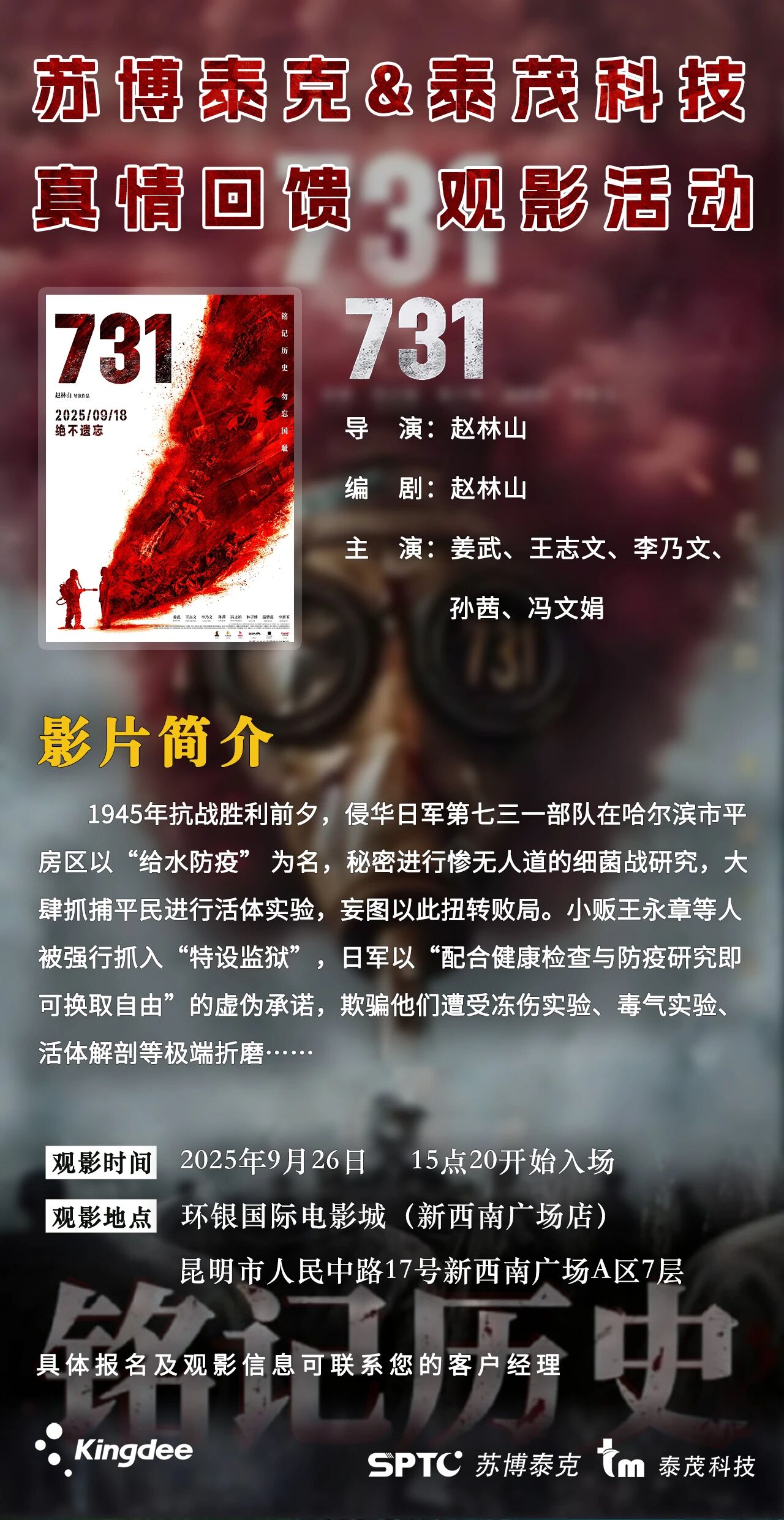 为回馈客户长期以来对苏博泰克&泰茂科技的支持与关爱,提升小微企业客户服务体验,增强小微企业客户满意度,苏博泰克&泰茂科技公司于9月26日下午在昆明市环银国际影城组织了一场免费观影活动,诚邀到110多位老客户到场参与,大家在融洽的氛围中共同观看了近期热映的精选爱国电影《731》