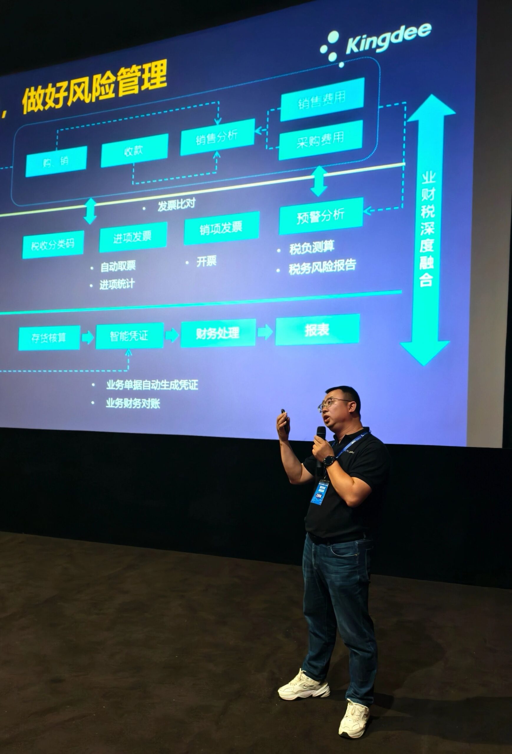 蒋历昕先生在后续的讲解中给客户分享了解决方案,简明扼要地介绍了金蝶云·星辰的产品优势,并通过案例向客户展示星辰解决方案的显著成效,获得了台下观众的认可。作为小微企业的云解决方案,金蝶云·星辰的一站式SaaS管理云平台,能够为客户提供业财税一体化深度融合、财税管理智能化、银企直连、数据异地备份、手机移动办公、后端升级迭代等多功能综合应用,可以满足绝大部分客户日常工作需求,提高系统管理效率