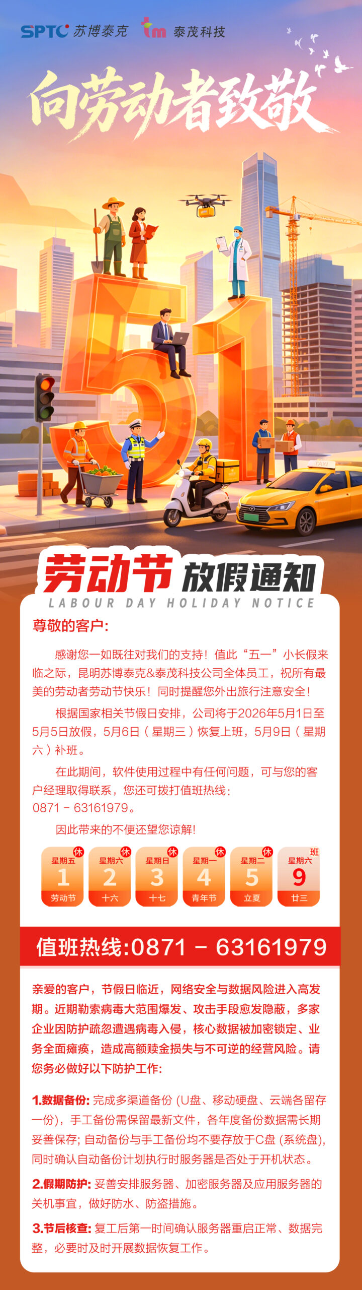 各位客户伙伴:大家好!五一假期将至,先祝大家节日快乐、出行平安!